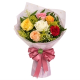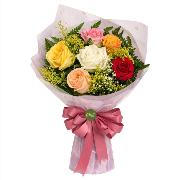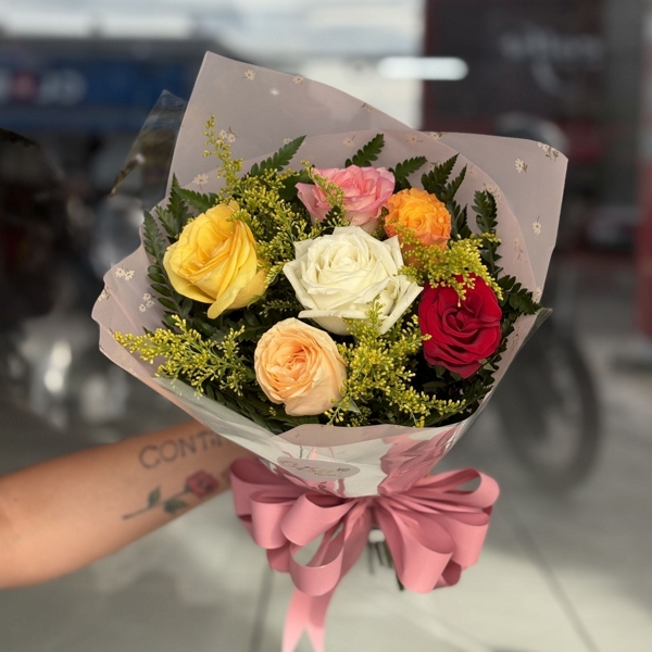 Encante com a alegria e a diversidade deste buquê composto por 6 rosas coloridas, uma combinação vibrante que transmite sentimentos positivos como carinho, amizade e celebração. Um presente versátil e cheio de significado, ideal para diferentes ocasiões especiais.