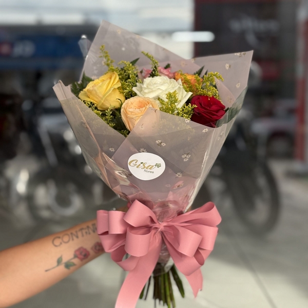 Trabalhamos com flores naturais, por isso é normal que haja pequenas variações de tamanho, formato e tonalidade. Este buquê é confeccionado com rosas, que podem apresentar variações de cores conforme a disponibilidade, podendo ser enviadas em diferentes tonalidades. As rosas também podem ser enviadas com botões mais fechados ou mais abertos, conforme o estágio natural da flor no momento da montagem. Essas características são próprias do produto e independem do controle da Gisa Flores.