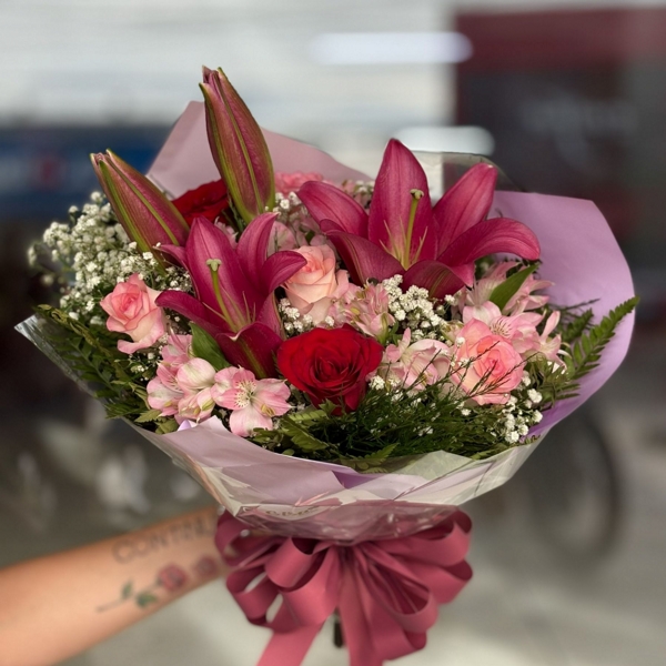 Trabalhamos com flores naturais, por isso é normal que haja pequenas variações de tamanho, formato e tonalidade. Este buquê é composto por lírios, rosas e astromélias. Os lírios podem apresentar variações em cor, tamanho e estágio de abertura. As rosas podem variar em tonalidade, tamanho e também no ponto de abertura. Já as astromélias podem apresentar variações de cor, formato e quantidade de flores por haste, além de poderem ser enviadas em diferentes estágios de abertura. Essas características são próprias do produto e independem do controle da Gisa Flores.
