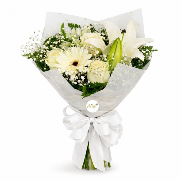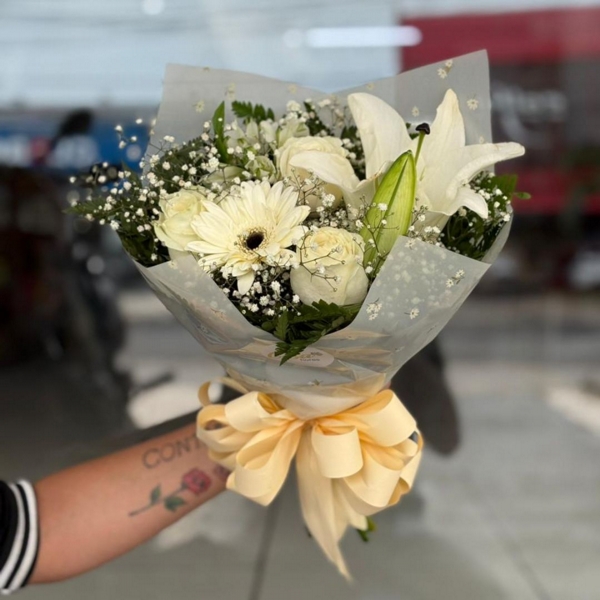 Trabalhamos com flores naturais, por isso é normal que haja pequenas variações de tamanho, formato e tonalidade. Este buquê é composto por lírios e flores brancas variadas. Os lírios podem apresentar variações em tamanho, tonalidade e estágio de abertura. Já as demais flores podem variar em tipo, formato e composição, conforme a disponibilidade e a proposta do arranjo. O gipso também pode apresentar variações em sua densidade e distribuição. Essas características são próprias do produto e independem do controle da Gisa Flores.