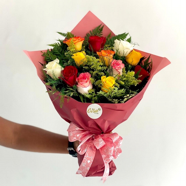 Este buquê tradicional com 12 rosas coloridas é uma escolha alegre e cheia de personalidade, ideal para transmitir carinho, felicidade e boas energias. A combinação de diferentes cores de rosas representa uma mistura de sentimentos como amor, amizade, gratidão e admiração, resultando em um arranjo vibrante e encantador, perfeito para presentear em diversas ocasiões.