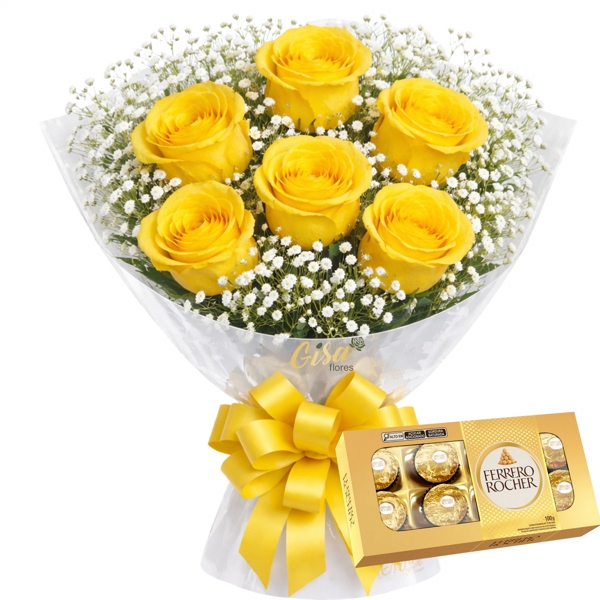 Este buquê tradicional com 6 rosas amarelas e Ferrero Rocher é uma opção delicada e cheia de significado, ideal para transmitir carinho, amizade e boas energias com um toque especial de doçura. As rosas amarelas simbolizam alegria e positividade, enquanto o chocolate complementa o presente de forma elegante e irresistível, tornando-o perfeito para surpreender em diversas ocasiões.