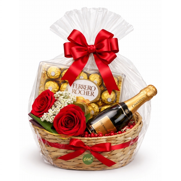 A composição é complementada por uma garrafa de Baby Chandon, perfeita para brindar ocasiões marcantes, e por uma caixa de chocolates Ferrero Rocher com 12 unidades, trazendo ainda mais sabor e requinte ao presente.