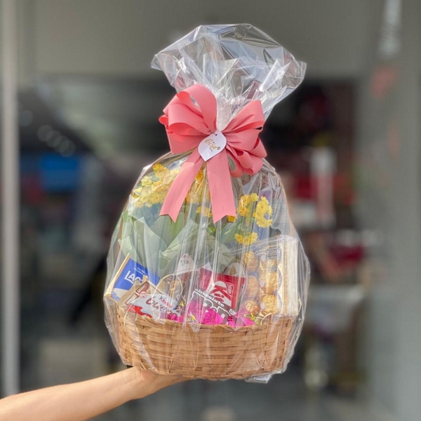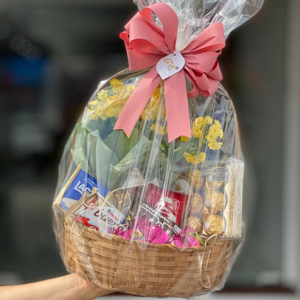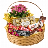 Uma deliciosa cesta de café da manhã incluindo diversas guloseimas. São variedades de chocolate, bombons Sonhos de Valsa, chocolates em barra e um arranjo delicado de flores.