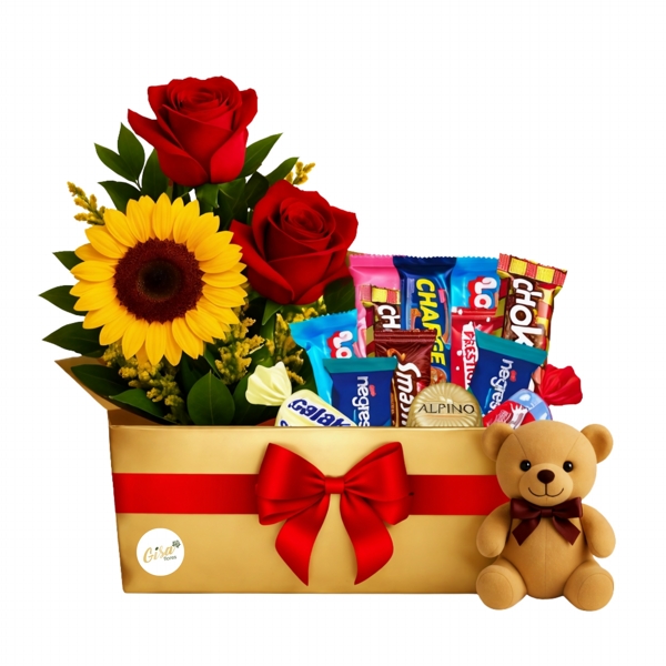 Tamanho: , Duo de Rosas + Girassol, Chocolates e Ursinho