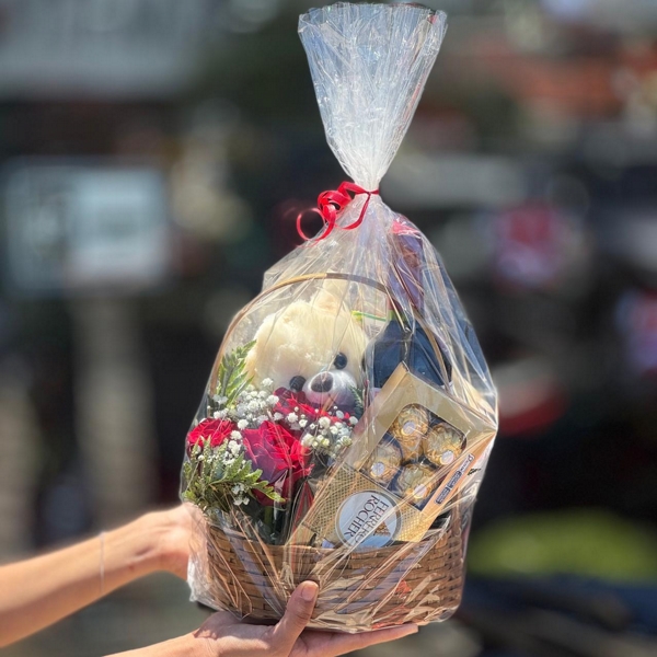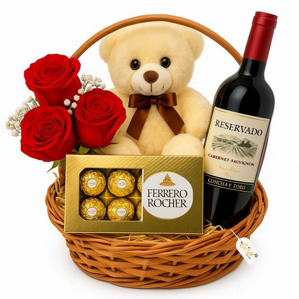 Nossa cesta é feita de palha de alta qualidade, conferindo um toque rústico e elegante. Na cesta você encontrará um arranjo de três rosas vermelhas, simbolizando amor e paixão. Ao lado, uma caixa de chocolates Ferrero Rocher espera para surpreender os sentidos com seu recheio cremoso e avelãs crocantes.