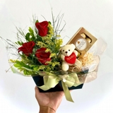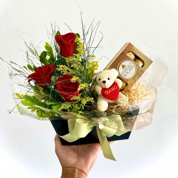 Um arranjo delicado e cheio de significado, perfeito para surpreender com carinho e romantismo. A combinação das rosas vermelhas com o ursinho de pelúcia e os chocolates cria uma proposta encantadora, ideal para demonstrar afeto de forma elegante e inesquecível.